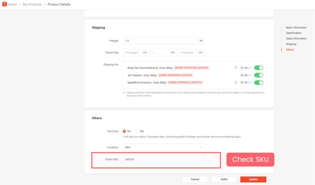 To resolve SKU issues, simply proceed to the Seller Center or dashboard of the affected sales channel. The instructions for changing SKU vary according to each platform, but typically SKUs can be edited at the Product Details page. The following example is for the Product Details page on Shopee Seller Center:
